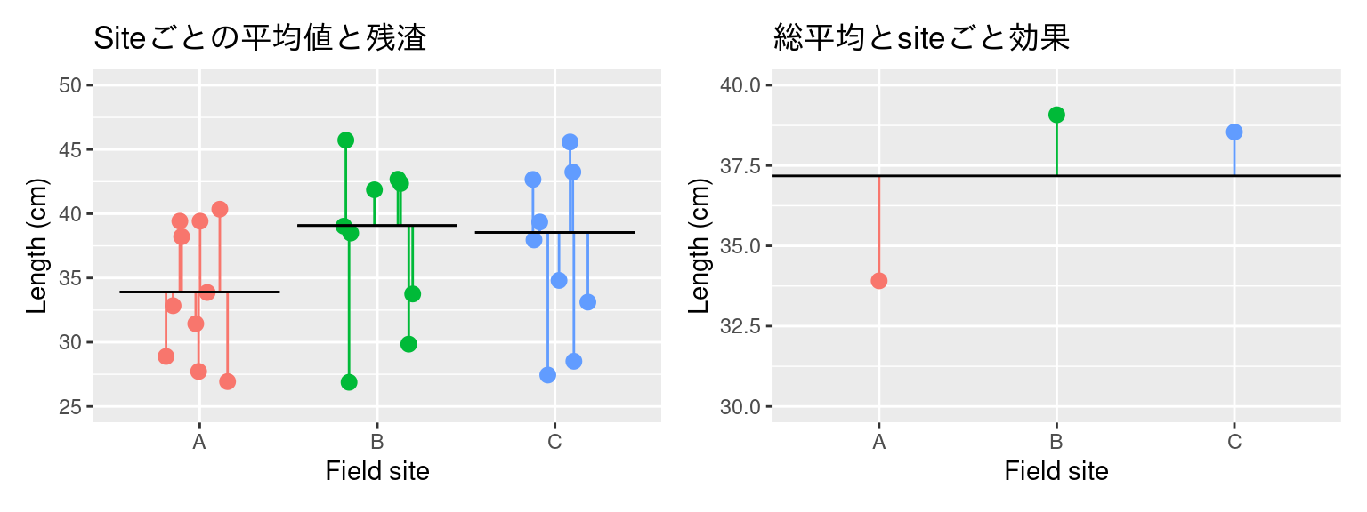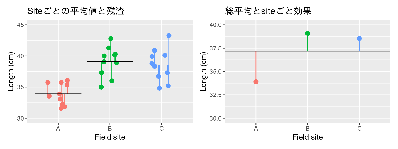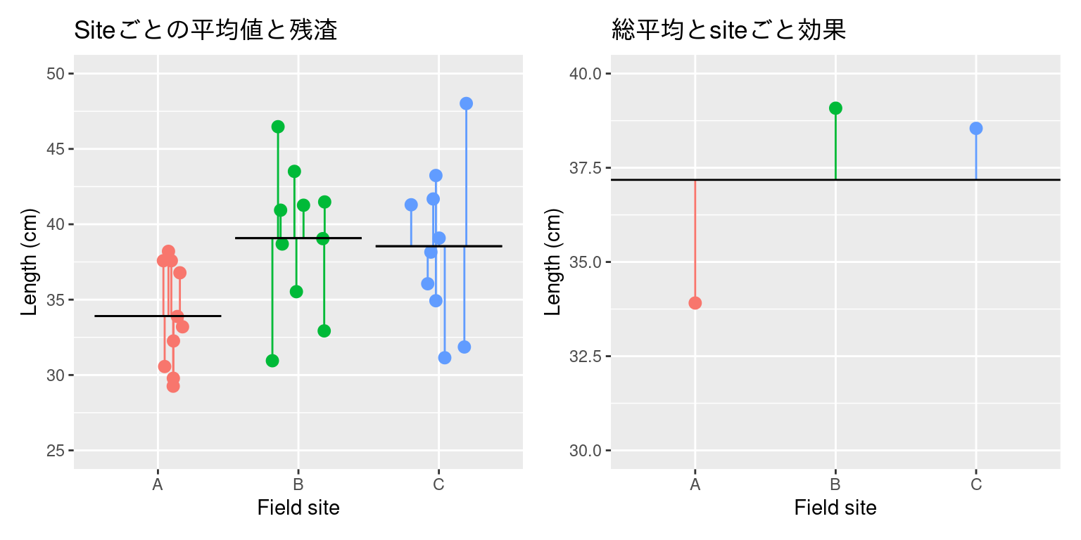 残渣平均平方は Field site (site 変数) ごとの残渣に影響されます。残渣のばらつきが小さいほど,残渣平均平方が小さくなります。 総平均に対する Field site の効果が大きければ,水準間平均平方が大きくなります。
