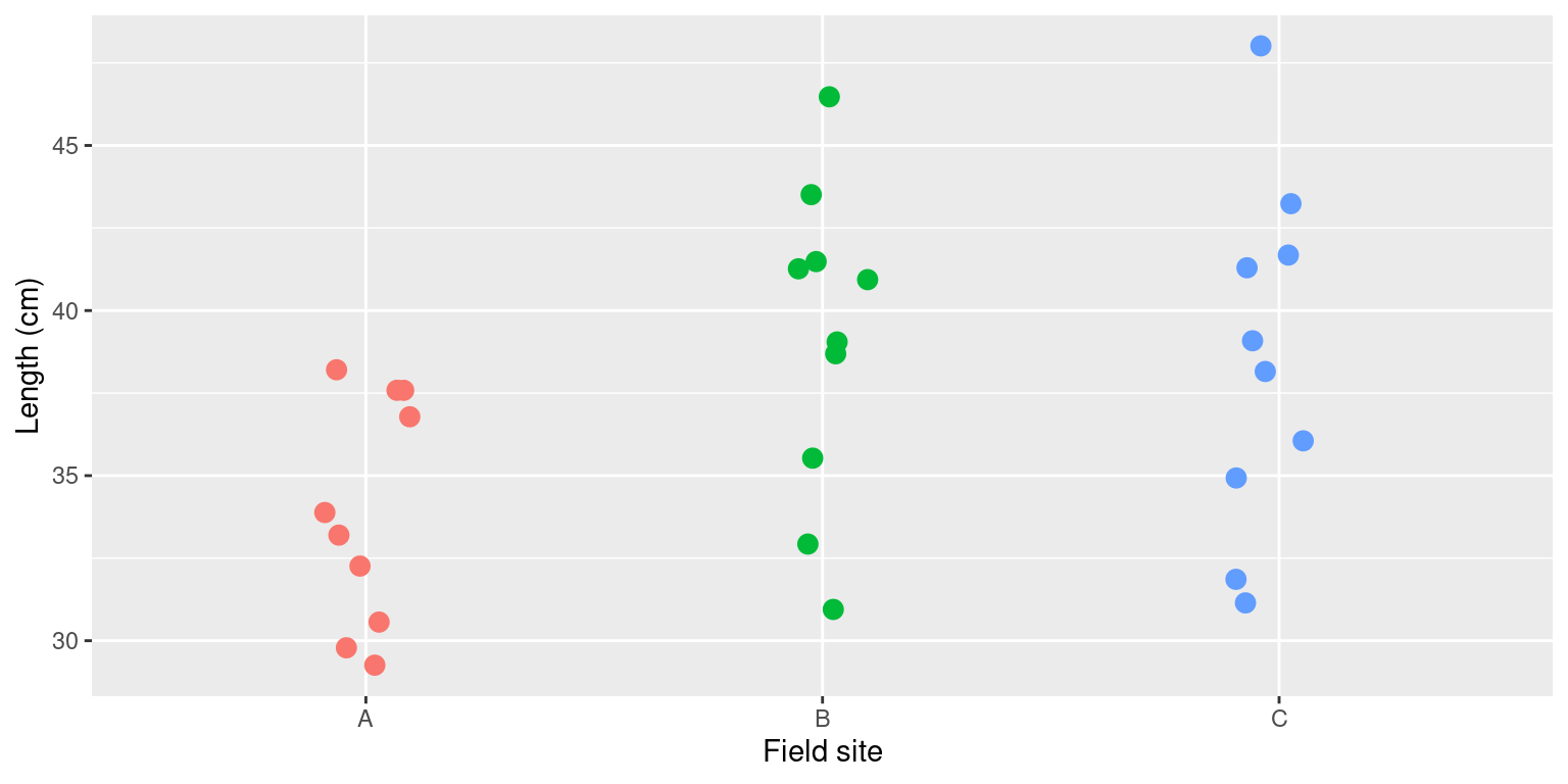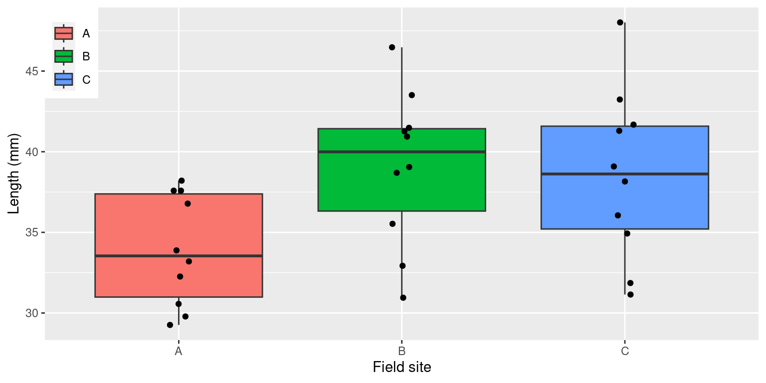 対立仮説: 一つ以上のアマモの海域ごとの全長は異なる \((\mu_A \neq \mu_B |\mu_A \neq \mu_C|\mu_B \neq \mu_C)\)
