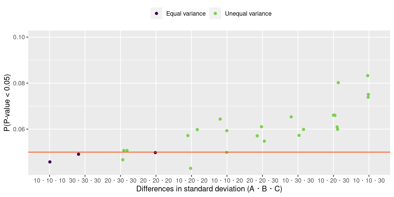 事前比較のとき,第 1 種の誤りは分散分析の \(\alpha\) と同じです。 事後比較のとき,第 1 種の誤りを新たに求める必要があります。