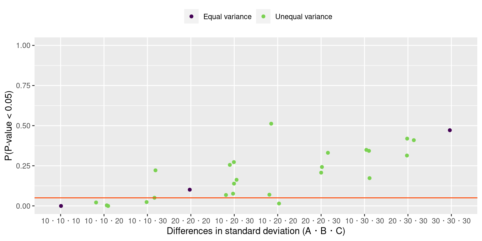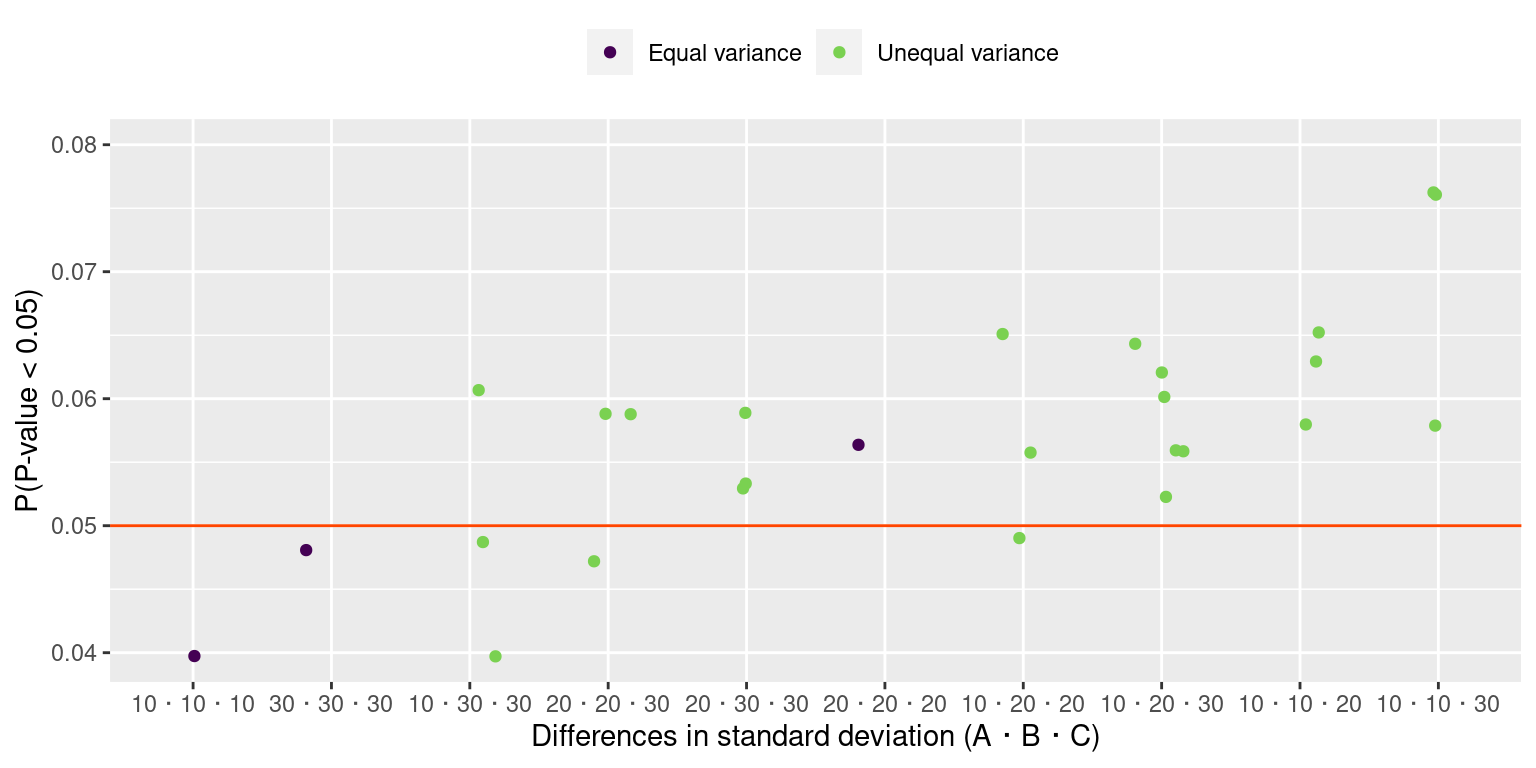 実は,最初から多重比較をするつもりであれば,分散分析をする必要はないです。 分散分析をすることにより,\(\alpha_{\text{fwer}}\) をあえて上げています。ところが, 有意性のある分散分析を求めてから,多重仮説検定を行なうことが一般です。