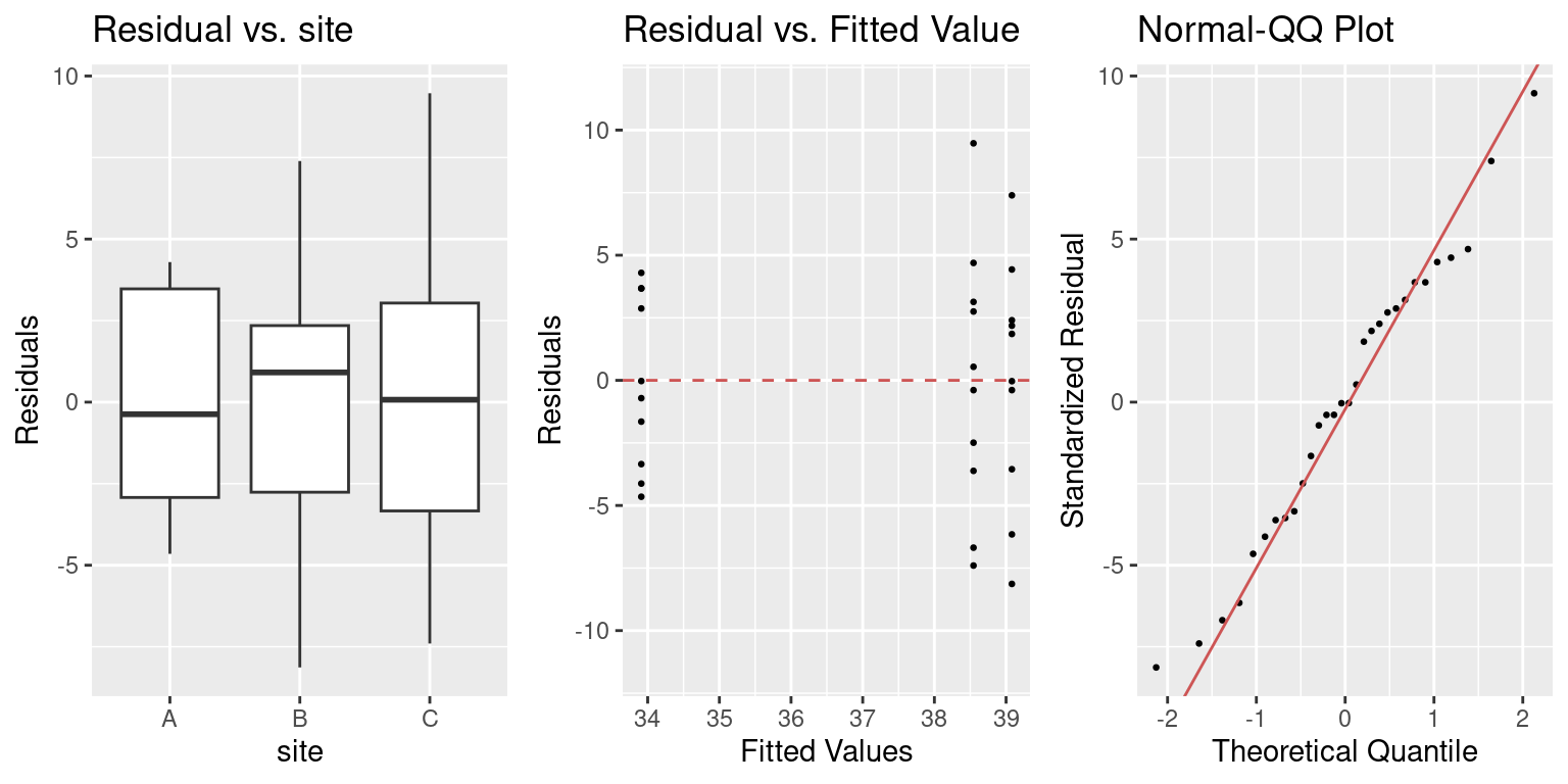 Residual vs. site と Residual vs. Fitted Value の図は残渣の性質を確認するための図です。 この二つの図で確認するのは,残渣のばらつきとばらつきの性質です。ばらつきが説明変数となんかしらの関係があれば,解析に問題があると示します。Normal-QQ Plot は残渣の正規性を確認するための図です。残渣は正規分布に従えば,赤線とかさなります。この結果をみると,正規性に問題はないが,期待値が高いときの残渣のばらつきは期待値の低いときのばらつきより大きいです。