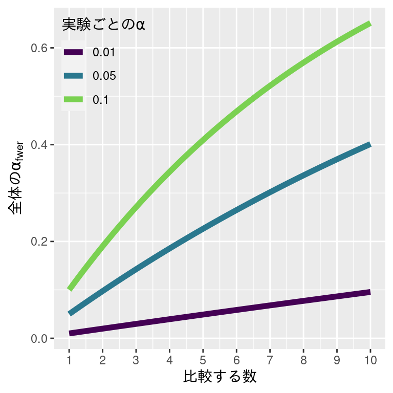全体の \(\alpha\) 過誤をおさえたければ,各実験の \(\alpha\) を抑えれことが必要です。