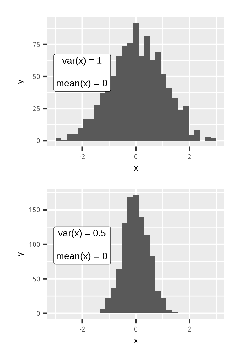 \[ \widehat{\sigma}^2=\frac{1}{n}\sum_{i=1}^n\left(x_i - \overline{x}\right)^2 \] The value of the sample variance \((\widehat{\sigma}^2)\) is smaller than the population variance (母分散). In otherwords, if \(n\) is small, then \(\widehat{\sigma}^2 \ll \sigma^2\).