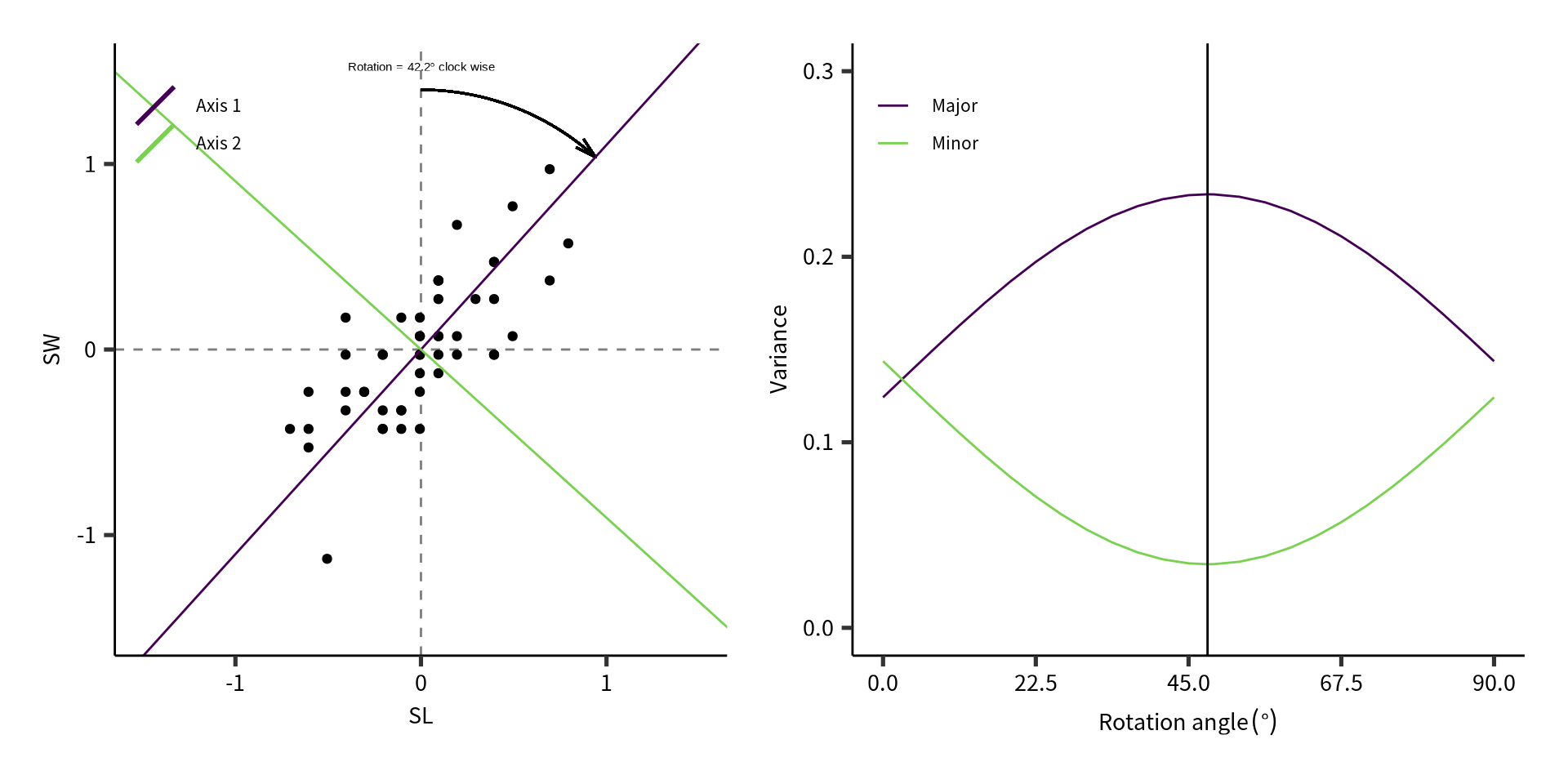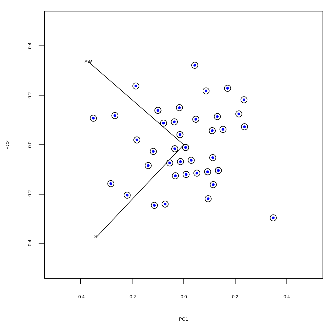 Therefore, for variable SL, the loadings on PC1 and PC2 are -0.325 and -0.137, respectively. The cosine of the angle between loadings are their correlation.