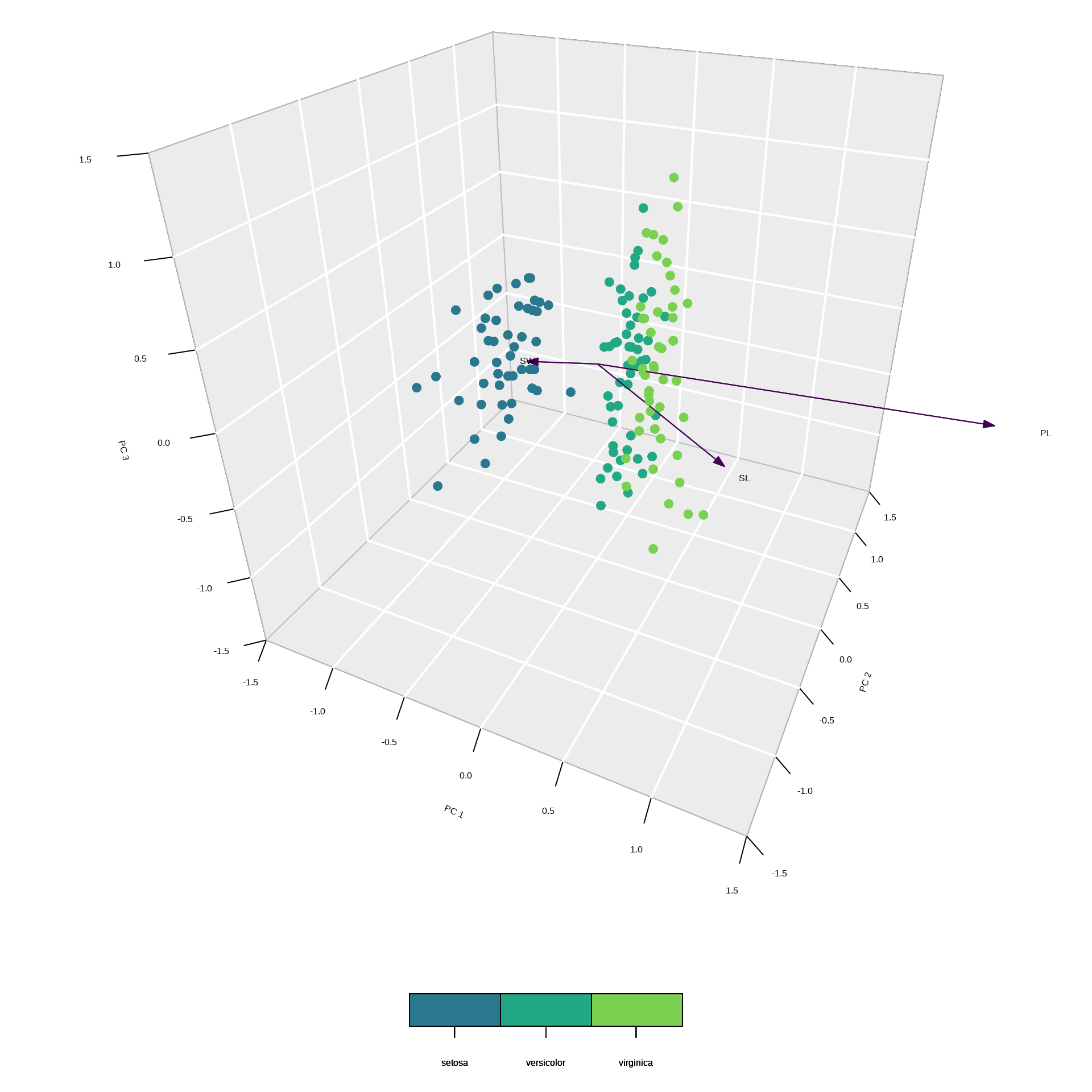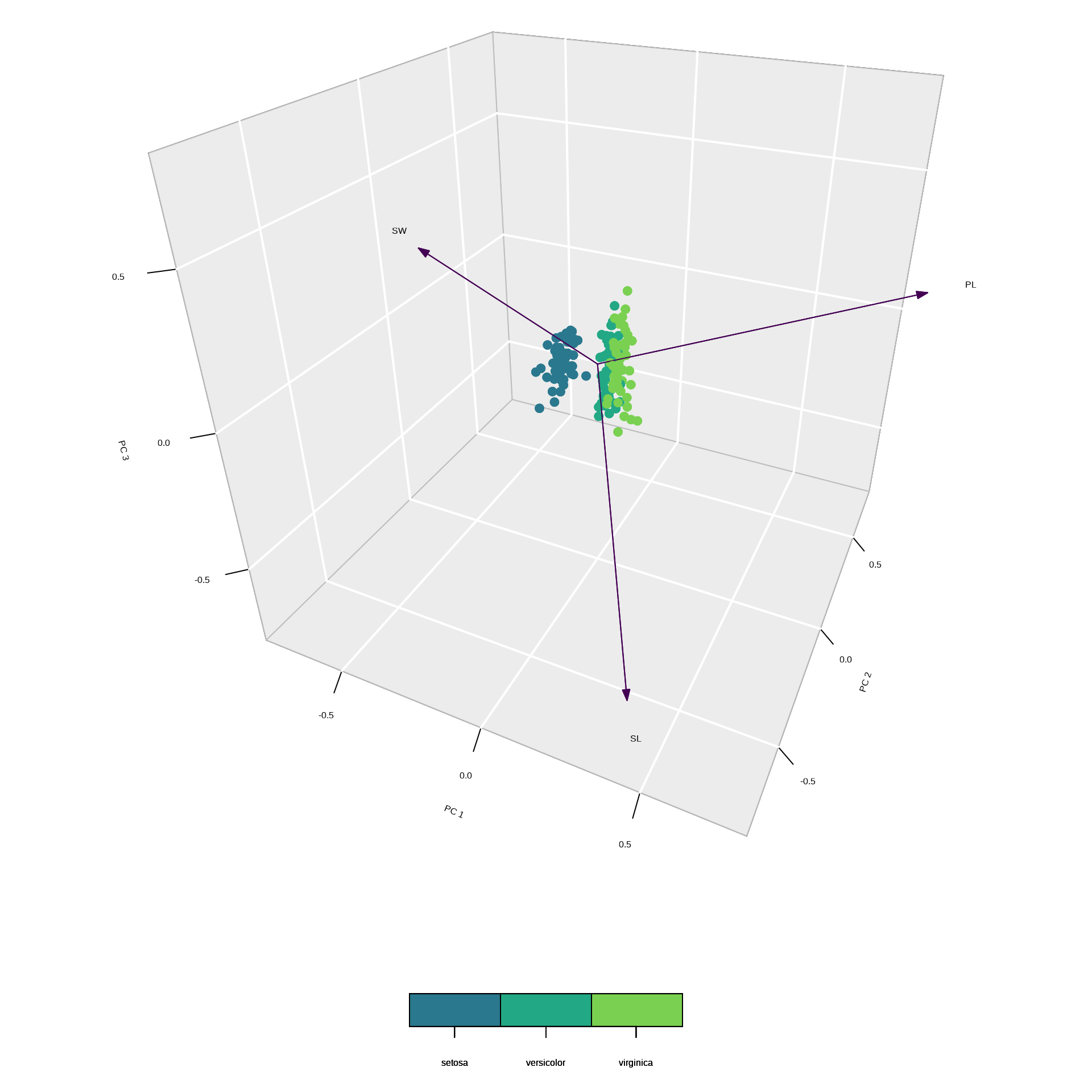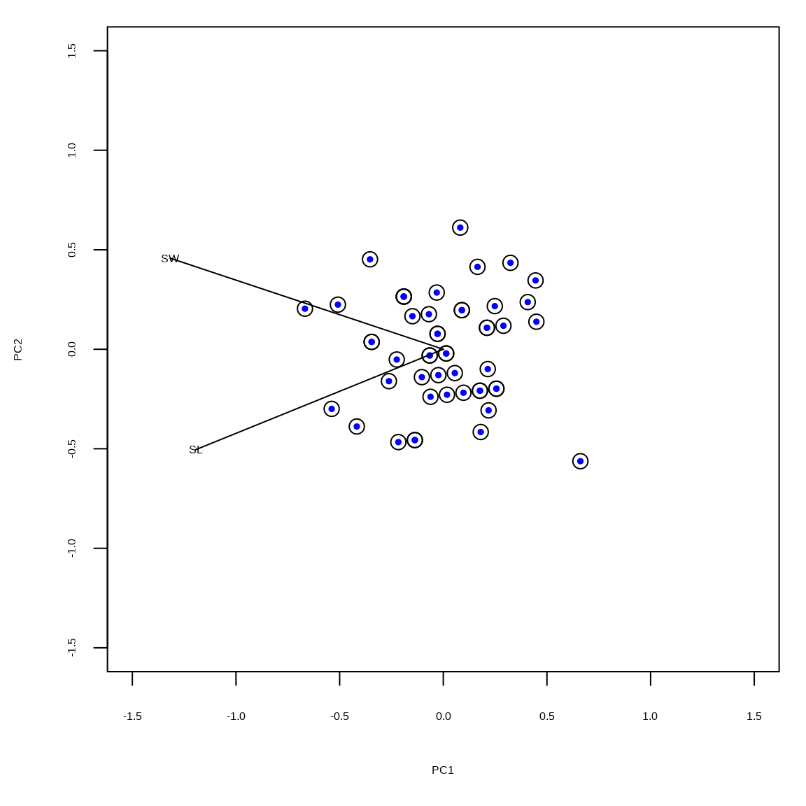 The SL and PL vectors are positively correlated with PC1 (0.9045 and 0.9045, respectively). Whereas the SW vector is negatively correlated with PC2 (-0.3793).