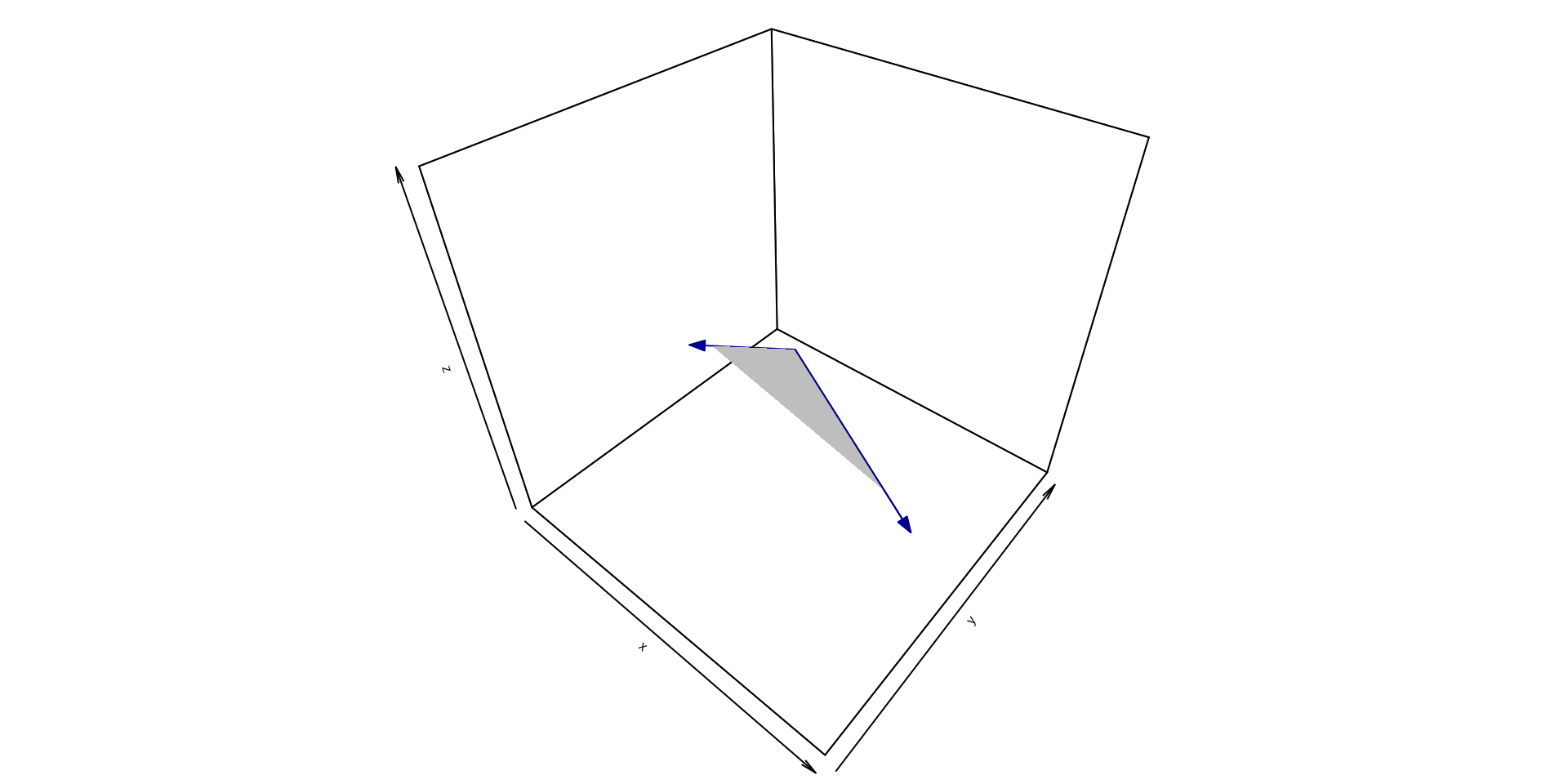 \[ \cos\theta = \frac{-0.26}{2.05 \times1.08} = -0.12 \] The correlation between the two vectors is -0.12. The angle between the two vectors is \(\cos^{-1}(\text{-0.1176}) =\) 1.6886 radians, or 96.7519\({}^\circ\).