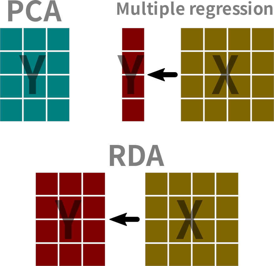 Redundancy analysis (RDA)1 a canonical ordination2 method and is one type of asymmetric canonical analysis3 that is used to analyze two data tables simultaneously. In RDA we are interested in how the environmental data \((\mathbf{X})\) influences ordination of the observation data \((\mathbf{Y})\). Recall that PCA is an unconstrained ordination4.