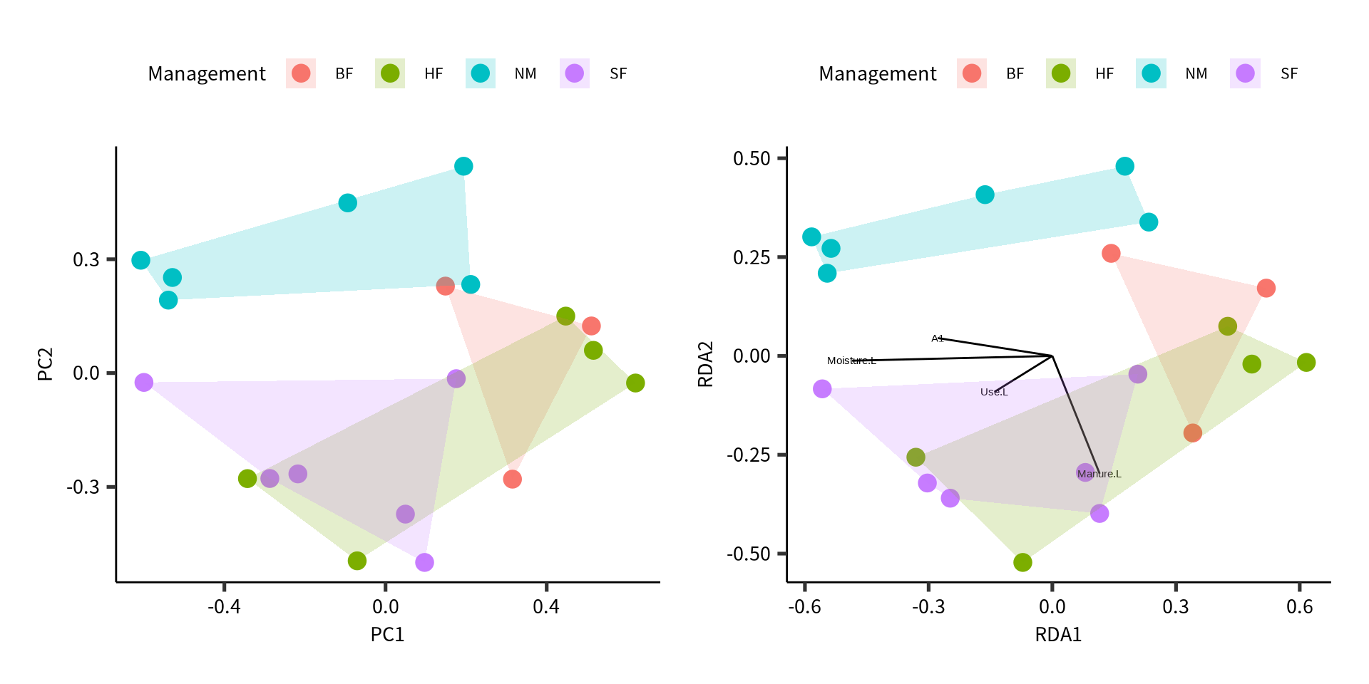 Model: rda(formula = dune ~ A1 + Moisture + Use + Manure, data = dune.env)